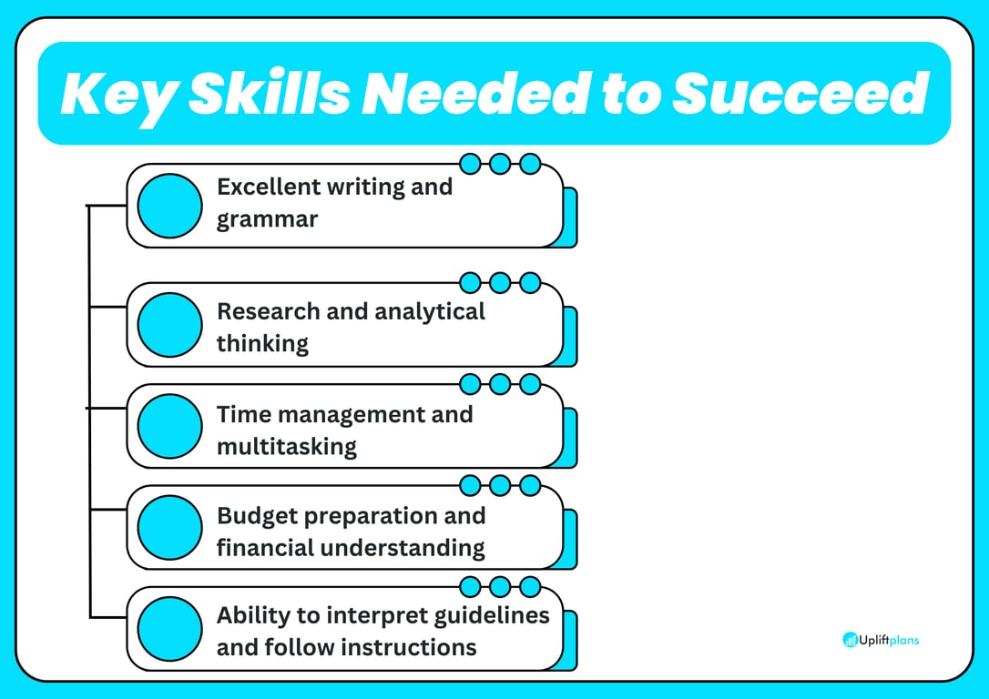 To succeed as a grant writer, a person needs a mix of strong writing skills, good thinking, and the ability to stay organized. This job is not just about writing, it also involves planning, working with others, and understanding what each funder wants.