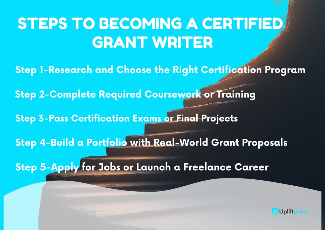 Becoming a certified grant writer involves following a few clear steps that prepare you for professional success. This process includes selecting a reputable certification program, completing the necessary coursework, and demonstrating your abilities through exams or final projects. After certification, building a portfolio with real-world examples and applying for employment or freelance opportunities will help establish your career. Each step is essential for gaining the knowledge, experience, and credibility needed in the grant writing field. These steps are;