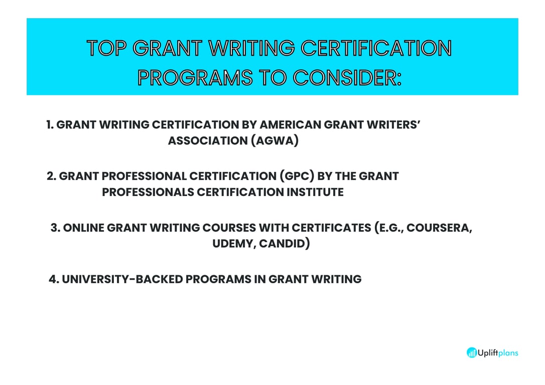 To learn grant writing and earn a certificate, there are several good programs to choose from. Some are offered by well known groups, and others come from trusted schools or online websites. These programs teach you how to write clear proposals, follow funder rules, and understand the full grant process. The right program can help you feel more prepared and show others you have been trained. It is important to compare the cost, how long the course takes, and if it is online or in person. Picking the right one depends on your time, budget, and learning needs. Below is a description of some of the certification programs;